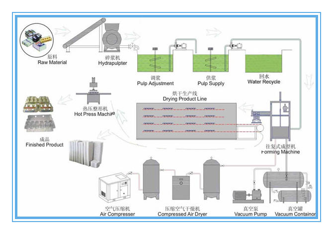 The egg carton production line includes three working systems: pulping system, forming system and drying system